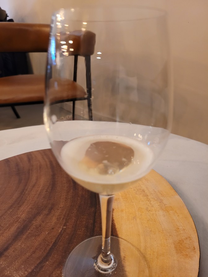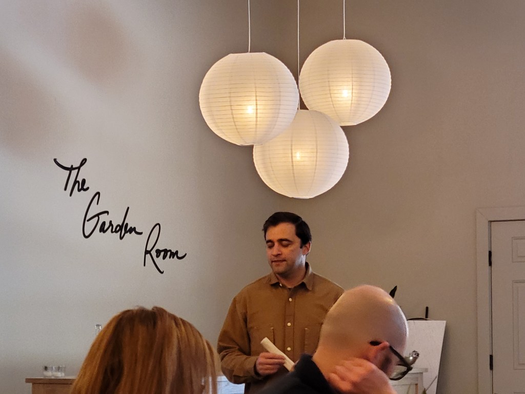 First up, the Pet Nat Alta – made from Viognier and Gruner Veltliner. When poured, it really had a lot of pear in my opinion, and nice bubbles. Nate mentioned how Pet Nat tries to capture the essence of the cellar work with the aromatics and unfinished fermentation. This does that. I occasionally enjoy pet nat, but the somewhat yeasty flavors in them overwhelm me a bit – husband describes it as “tasting like beer.” It was a nice one, but I swapped this one so I could get four more merlot for good ole Favorite Brother-In-law.