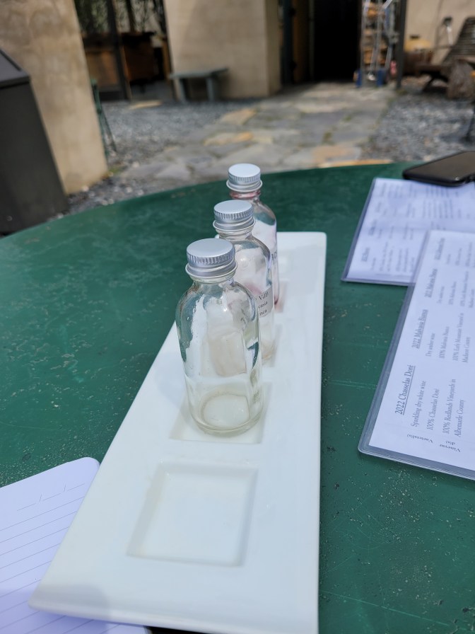 It is always wonderful to be the first ones at a winery a mere 20 minutes after opening. We arrived and were greeted and told that all tastings were conducted outside and provided a menu. We chose a table and chairs near the door into the facility and scoured the menu. We chose to do a white wine flight and red wine flight. Sadly, the rosé of malbec (grown at Turks Mountain, site of the incredible summer 2021 rose from Mt Ida!) was out of stock. Alas, we made it work.