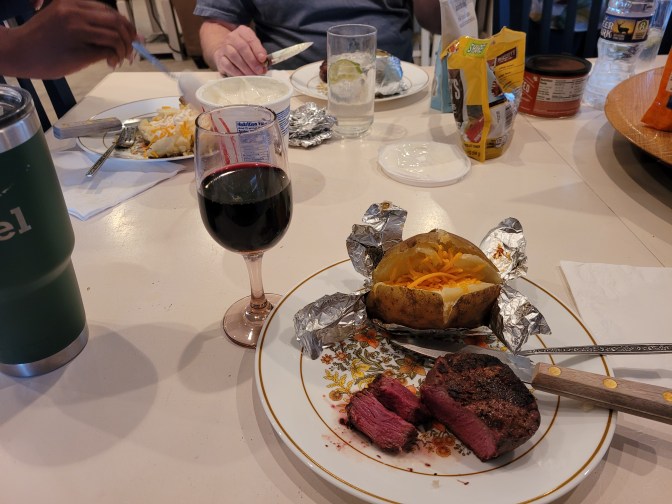 The depth of the purple reflects the depth of the wine. There is no wine decanter in the beach rental, sadly, so I had to try to be patient and let it get a bit of oxygen in the glass and strive to keep myself from drinking it. The wine was so wonderful and paired beautifully with the rare cut of steak.
