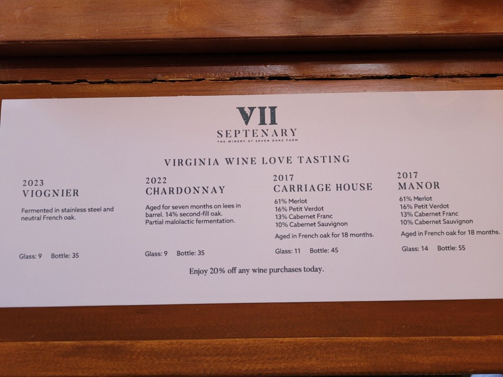 This weekend we took two friends to the Virginia Wine Love Meetup at Septenary. This was a special scheduled event for a small group with a guided tasting and tour and was really fun. I’ve been to Septenary before and enjoyed the wine and venue, and today was even more fun than last time!