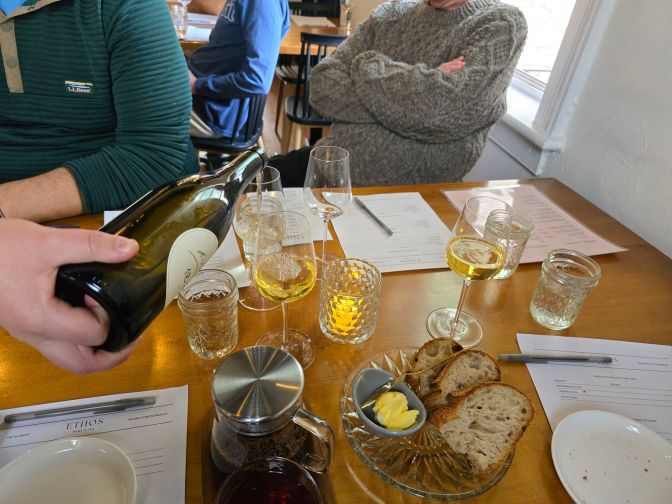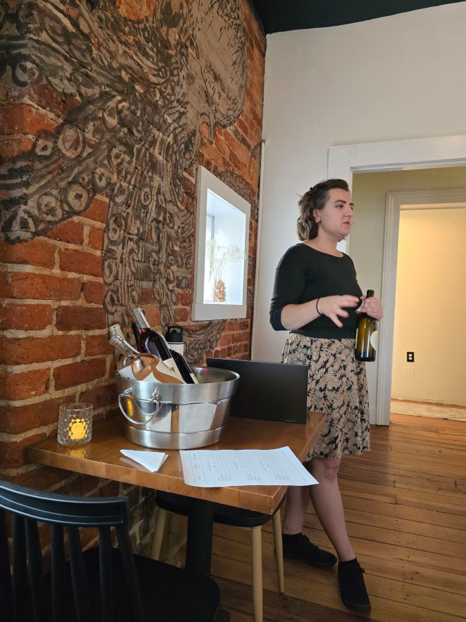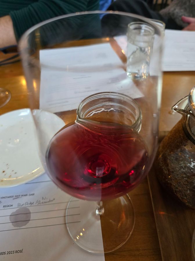 Our last wine was the Spinning Wheel Wines 2023 Not Nothing. I may have scooped Matt again, as he was unaware of this label, though he is very familiar with the grower and production facility. This winemaking project is a great exemplar of some of the exciting and innovative things happening in Virginia Wine right now. This trio doesn’t have a vineyard, doesn’t have a production facility, and they’re spread out across the East Coast. They purchased 2023 Chambourcin from the Mount Airy site farmed by Tim Jordan (of Commonwealth Crush fame). This was made with very low intervention – crush the grapes, drain the juice, ferment, and bottle. It was produced like a white wine, but because the Vitis Labrusca grapes (not Vitis Vinifera which produce so much of the wine we know and love) have red flesh, it produced dark red juice. As a Rosé, this wine appeared almost like a lighter red like a Pinot Noir in the glass.