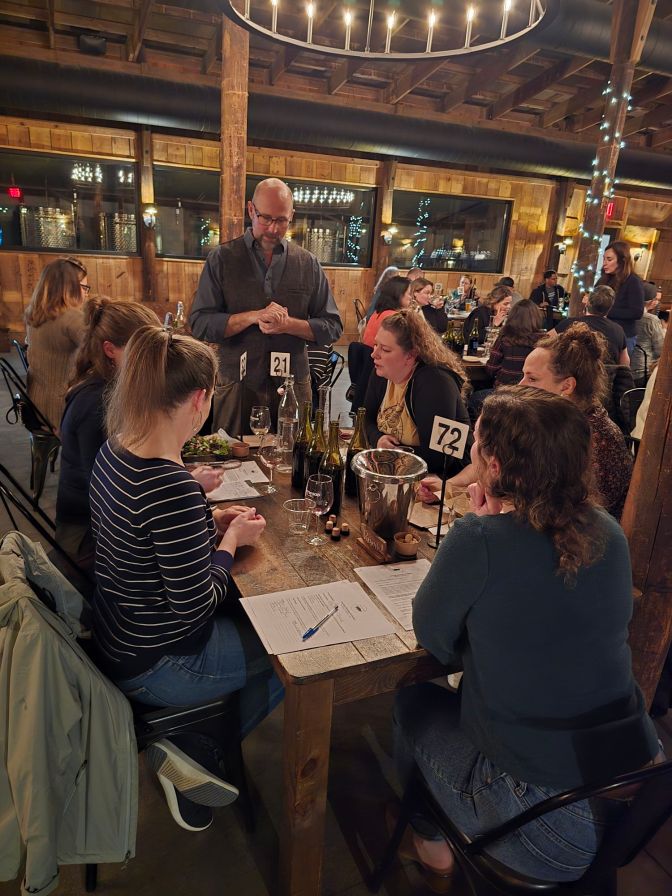 Athena started the evening introducing us and setting the ground rules for the competition. She talked to the group about the rules for making a Meritage, and explained that each team had four barrel samples to work with – the 2023 Merlot, 2023 Petit Verdot, and 2023 Cabernet Franc, as well as the 2021 Cabernet Franc. A Meritage had to blend at least three of the wines, and no wine could be more than 90% of the final blend. Each group went to work right away sampling their four components and starting to blend.