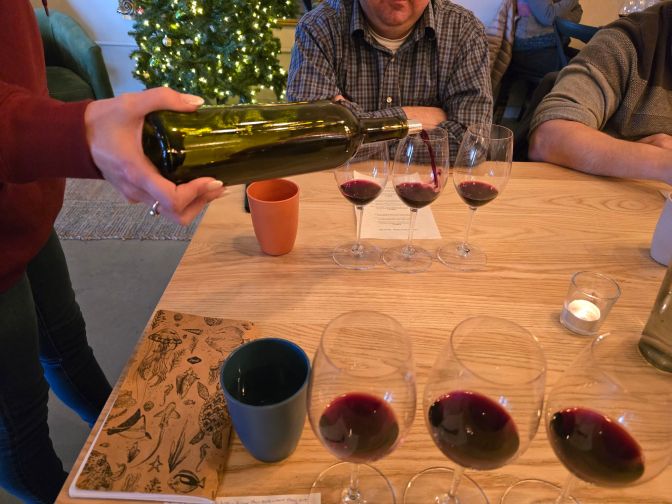 Our final flight held barrel samples of the 2023 Bethany Ridge Merlot, 2023 Bethany Ridge Cabernet Franc, and 2022 Bethany Ridge Petit Verdot. Nate told us that these components will become the Paeonia Red Blend, and the 2022 version will be released potentially this Spring. I’m very excited to see this come out. Bethany Ridge has 25 acres under vine right now and produces half of their fruit. From the first pour of this Merlot, I was in awe. Remember the 2023 vintage is knocking our socks off. This wine was put in a “2nd fill French oak puncheon.” A puncheon is a very large barrel, almost twice the size of a regular wine barrel, which allows for less oak contact with the wine (yielding lower oak influence) and less oxygen contact for less oxidization. As a 2nd fill, this barrel has reduced oak influence anyway, since it gave a lot of its power to the first wine it held. The Merlot was showing some oak influence, but this would be a lovely glass as it is now, unfiltered and unbottled. This will be blended and bottled in about four months. The Cabernet Franc pour was in 3rd fill Hungarian Oak – Nate told us that this oak imparts a spicy quality to the wines. The Cabernet Franc showed some interesting influence, but also felt extremely tannic. This will bring an exciting quality to the blend.