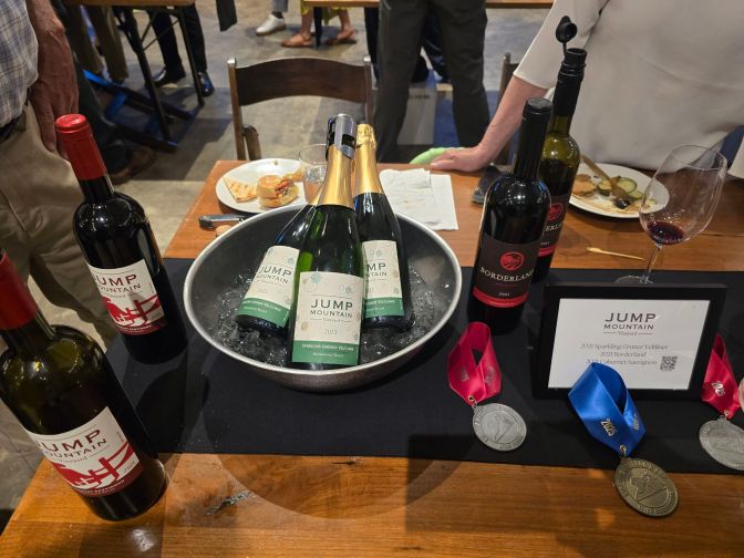 As we went back to the tables, we stopped at Jump Mountain. At one point, a commenter on social media suggested Jump Mountain as a spot to visit, and I filed that away in some dusty, infrequently accessed part of my brain. Here they were, and they had sparkling. Kenny, my friend Cindy, and I said our hellos and held our glasses out for some sparkling Gruner Veltliner. This was amazing.