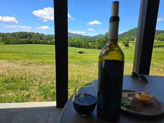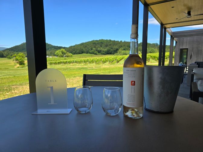 We ordered a baguette to finish up and soak up some of the wine we drank. We’d been talking with two couples seated near us about the wine, other wineries nearby, and life in general, and sharing some of the wine with them, and Steve decided that in addition to his case of 2019 Cabernet Franc Reserve (really smart call right there!) he’d get a bottle of the 2022 Cabernet Sauvignon for us to share with our new friends. This wine was just gorgeous. This is the silky Virginia Cabernet Sauvignon that I so adore – it has a lovely mouthfeel – complex but not overwhelming – not oaky (or at least not that I could detect) – and just wonderful. I brought a bottle home to decant with our steaks on the grill and it went beautifully with a nice rare cut of filet. I’m eagerly anticipating the 2023 vintage for this.