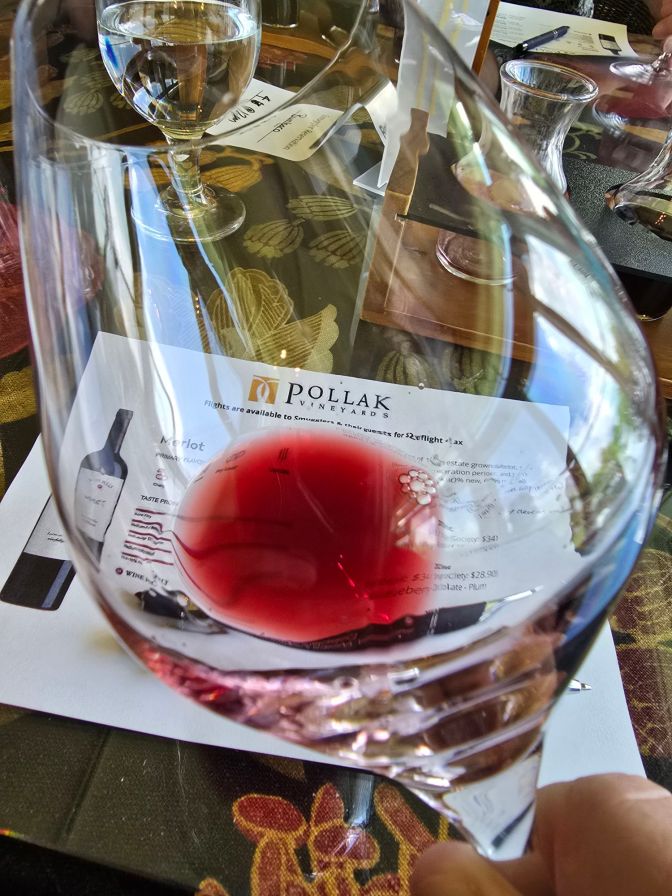 It pays to know people. It’s a good adage to live by, and knowing good people opens doors. As such, Kenny is a member of the Smuggler Society at Pollak Vineyards, and he invited Kathy and I (and hubby) to meet him at Pollak for a Merlot vertical sampling. A vertical tasting provides samples of wine made from the same grapes on the same site over several different vintage years. I adore vertical tastings to see the influences of different years on the wines, and in this case, several winemakers too! We had a great day.
