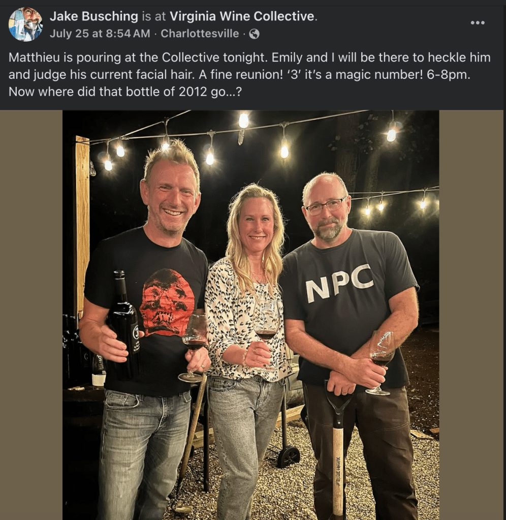 Waiting for us were three bottles of “3”—a collaborative red blend made by Jake Busching, Emily Hodson (Veritas), and Mathieu Finot (King Family). The first vintage was 2009, made while Jake was still at Pollak. By 2010, Jake had transitioned to Grace Estate and was working with Emily using Veritas equipment. Mathieu was a natural addition to the team—his neighboring winery in Crozet made collaboration easy.
