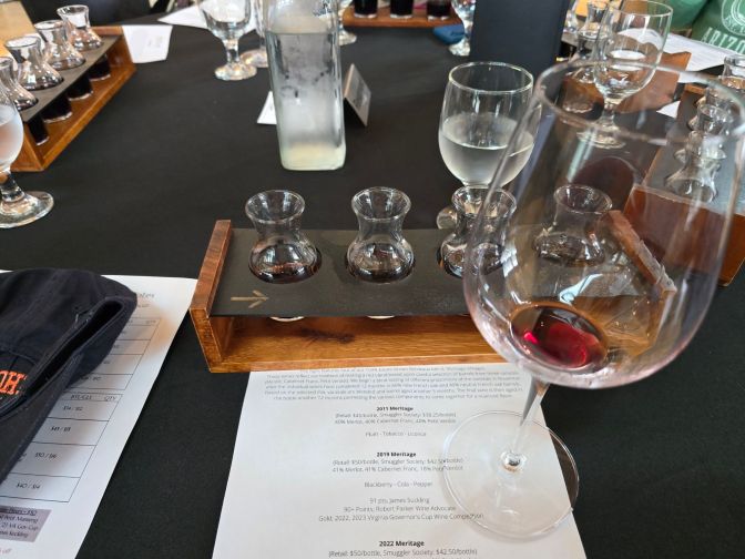 Then came the bonus pours: the 2015 Meritage, which began with a touch of barnyard funk that faded into a leathery, dark, elegant wine, and the 2022 Smuggler, their $75 flagship red blend. It was incredible — deep, refined, and absolutely a treat. I also grabbed a glass of the 2023 Merlot (still one of my current favorite Virginia reds), plus a splash of Petit Verdot for FBI and Viognier for my sister.