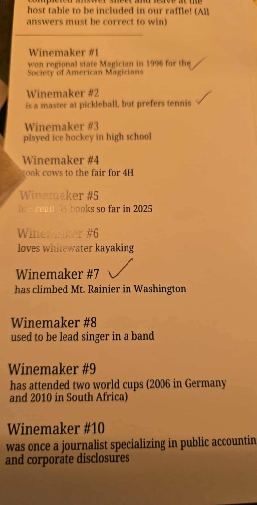 Jake was next, pouring his Cabernet Franc from 2022. I think this wine has been showing amazingly for the last few months, and it was paired with a salami and pepper appetizer. I think this wine will be great for the next several years – it has not peaked yet.