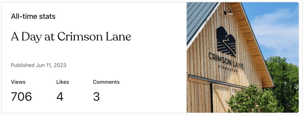 We have a new champion. A Day at Crimson Lane has crossed 700 total views, officially becoming the most-read post on the blog. I honestly don’t know how people keep finding it — I didn’t even think it was one of my strongest pieces. To the best of my knowledge, it was never widely shared by the winery or anyone else. And yet… here we are. The internet is mysterious.