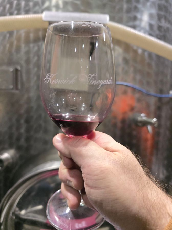 Stephen told us that Keswick intentionally steers away from the heavily buttered, oak-driven, grocery-store Chardonnay style. While I caught a hint of butter on the nose, it was light. Right now, it’s clean, bright and refreshing, with more complexity still to come. The wine is currently undergoing malolactic fermentation, which will add a soft, creamy layer.