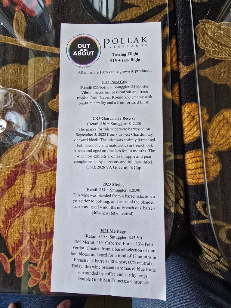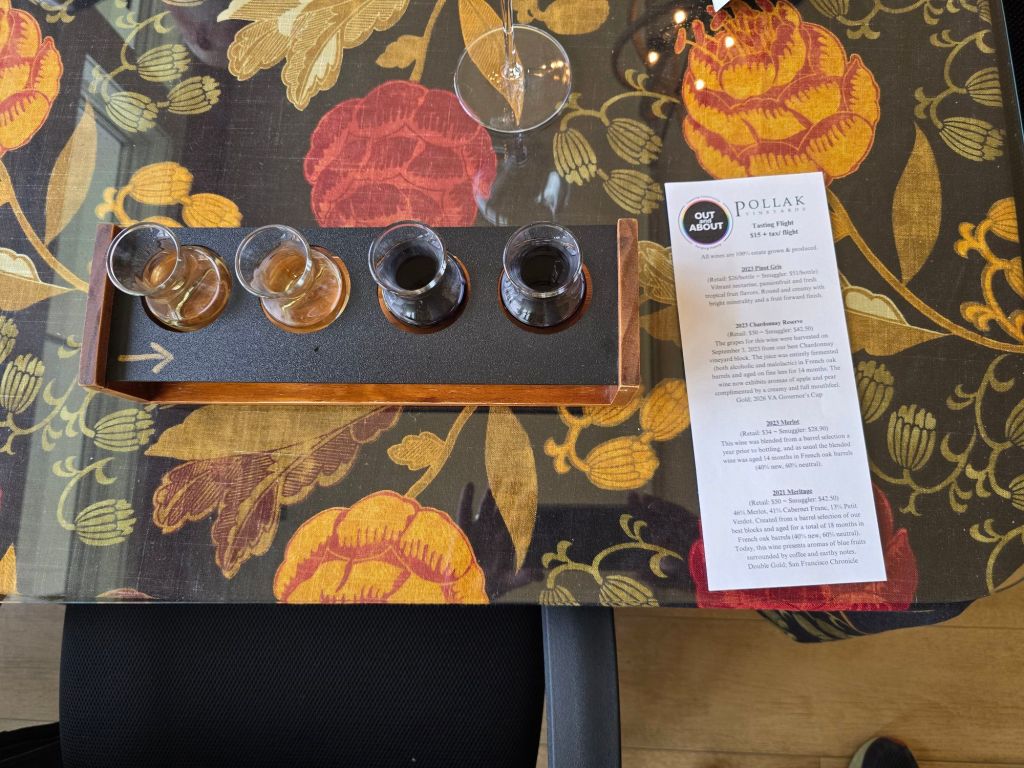 And the following Sunday, Pollak hosted the first Out and About winery visit of 2026! I worked with Sarah in the tasting room to make a custom flight (they were so wonderful to do this!) that included the 2023 Pinot Gris, Gold Medal 2023 Chardonnay Reserve, 2023 Merlot, and 2021 Meritage. While we had a smaller turnout, it was a beautiful day and the wines were spectacular. People gravitated to the Chardonnay Reserve and a few also scooped up the 2023 Merlot Reserve (which was on point this weekend).